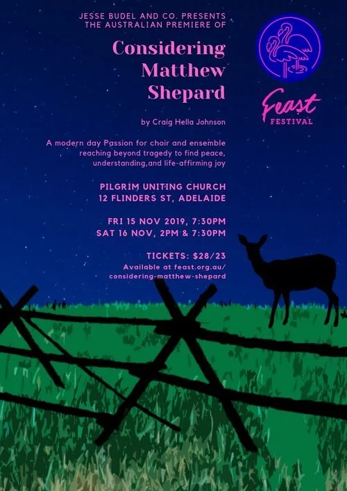 In November, as part of Adelaide’s annual LGBTIQA+ Feast Festival, I had the privilege to produce and conduct the Australian premiere of Considering Matthew Shepard, a passion oratorio by American composer Craig Hella Johnson. Originally written for Johnson’s Austin-based choir, Conspirare, the 110 minute work recounts the story of Matthew Shepard, a 21-year-old gay college student who was brutally beaten and left to die on a fence in Laramie, Wyoming in 1998. Working alongside 34 incredible South Australian musicians—both queer-identifying and allies—was an incredibly meaningful and rewarding experience, wherein each of us developed personal connections with Matthew’s story, Johnson’s music and the resonances of similar occurrences on our own shores (not least of which include George Duncan’s 1972 murder on University Bridge in Adelaide, and the notorious 1980s bashings in Sydney). As Ewart Shaw’s review generously summarises: